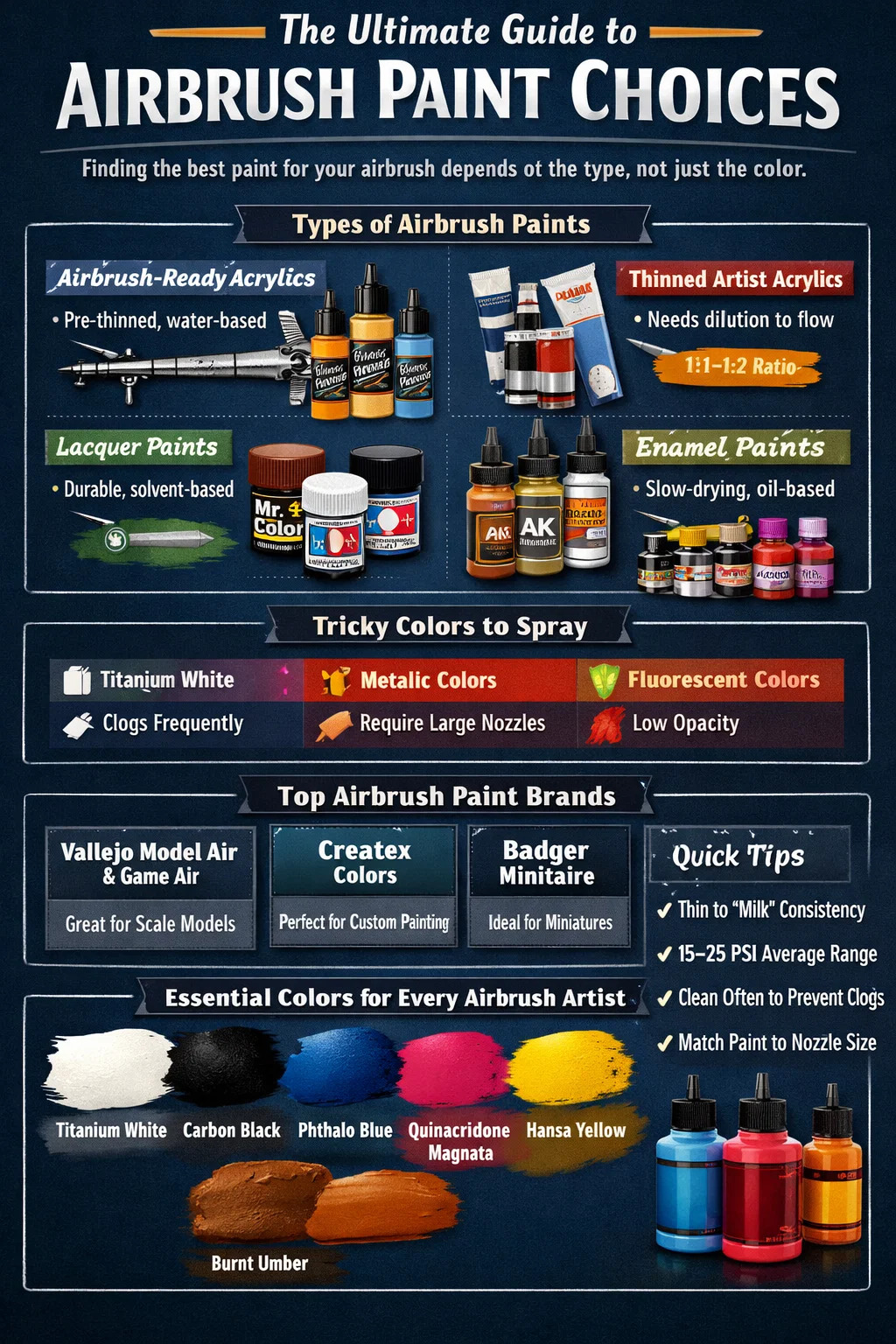 Trước khi đi sâu vào các màu sắc cụ thể, điều quan trọng là phải hiểu rằng airbrush không phân biệt giữa màu đỏ và màu xanh - nó phân biệt giữa sơn chảy và sơn bị tắc. Chất liệu (loại sơn) là yếu tố lớn nhất ảnh hưởng đến hiệu suất của airbrush. Dưới đây là bảng phân tích các danh mục chính: