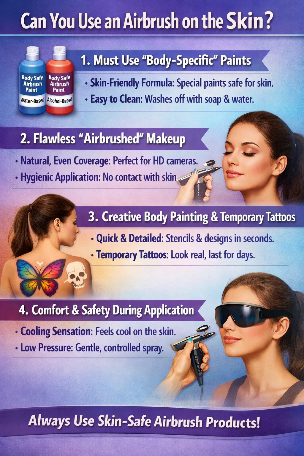 Sử dụng một airbrush trên da không chỉ đạt được mức độ chi tiết mà các ứng dụng bằng tay không thể so sánh được mà còn tạo ra hiệu ứng hình ảnh vô cùng chân thực. Tuy nhiên, vì da là một bộ phận của cơ thể con người nên có một số điểm cần lưu ý rất quan trọng: