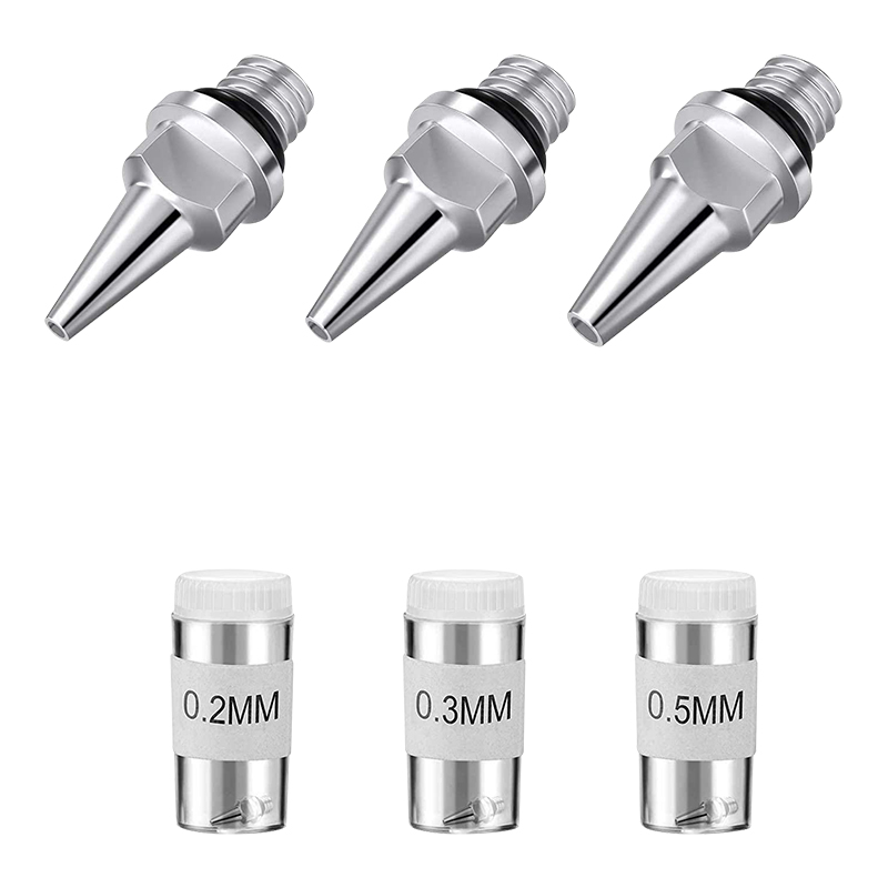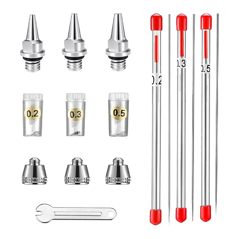 Bộ phụ tùng thay thế airbrush 10 mảnh cung cấp ba kích thước của vòi phun, mỗi kích thước phù hợp cho các nhu cầu phun khác nhau. Vòi phun kích thước nhỏ phù hợp để phun mịn, chẳng hạn như chi tiết nghệ thuật, chi tiết mô hình, v.v .; Vòi phun kích thước lớn phù hợp cho các hoạt động phun nước lớn, hiệu quả cao. Kim được sử dụng cùng với vòi phun để đảm bảo tính đồng nhất và độ mịn của sơn trong quá trình phun. Vòi phun bảo vệ vòi phun khỏi bụi và tạp chất và kéo dài tuổi thọ của vòi phun.